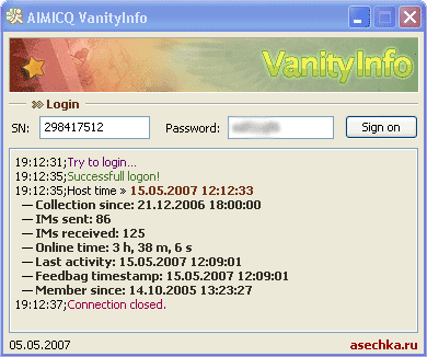 Имя в наличии AIM SN или ICQ SN и зная пароль от него можно получить ряд дополнительной информации об аккаунте. VanityInfo — это информация, которая включает в себя ряд таких данных: IMs sent — количество отправленных сообщений. IMs received — количество принятых сообщений. Online time — время проведенное в онлайне. Away messages — количество уникальных away-сообщений. (AIM*) Last activity — дата последней активности, хотя наверное лучше сказать, что это дата последней модификации Vanity-информации. Collection since — дата, указывающая на начало обновления этой информации, т.е. это дата с которой началось сохранение статистики. В конце 2006 года из-за ошибки внутри системы учета и накопления информации, все ранее сохраненные данные были утеряны, так что максимальное время, с которого может быть сохранена информация — это где-то декабрь 2006 года. Так же выводится дополнительная информация: Member since — дата регистрации аккаунта. Feedbag timestamp — дата последней модификации серверного контакт листа. Away update — дата последнего обновления away-профиля. (AIM*) Profile update — дата последнего обновления info-профиля. (AIM*) Feed update — дата последнего обновления feed-потока. (AIM*) *AIM — в основном это относится к AIM-аккаунтам.*